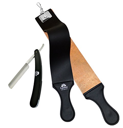 The Equinox Barber Straight Edge Shaving Razor and Wide Leather Shaping Strop Set - Sharp Stainless Steel Straight Edge Blade - 3" Wide High Quality Genuine Leather Strop for Sharpening After Use - Combo Pack SALE! (Black) is one from a lot product that I recommended for you that you want buy straight razors for sale.