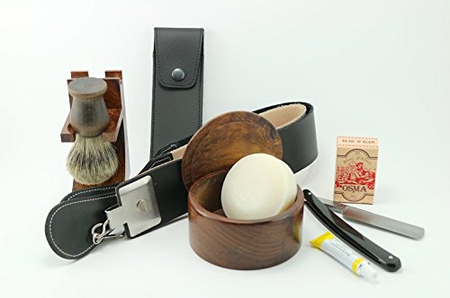 The 9 Piece Deluxe Straight Razor Shaving Set : 5/8'' Razor, Pure Badger Brush, Strop, Bowl, Leather Case, Paste, Osma Block and More! is one from a lot product that I recommended for you that you want buy shaving with a straight razor.